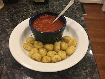 Potato dumplings cooked in an air fryer until crisp on the outside and tender inside, tossed with herbs and spices, and served with a tomato sauce.